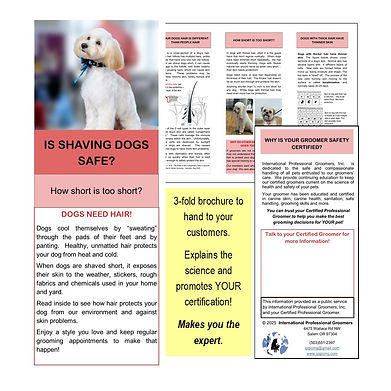 Certified Professional Groomer (CPG) Safety certification for Groomers, who will do a bath and dry and clippered pet trim on any breed. Also available in Spanish.
